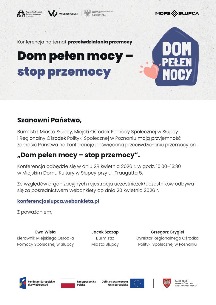 Wydarzenie odbędzie się 28 kwietnia 2026 r. w Miejskim Domu Kultury w Słupcy (ul. Traugutta 5). W programie przewidziano wystąpienia ekspertów, projekcje nagrodzonych filmów oraz panele poświęcone m.in. rozpoznawaniu przemocy, skutecznym formom pomocy oraz pracy z osobami dotkniętymi i stosującymi przemoc.